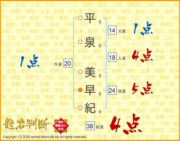 平(5画)泉(9画) 美(9画)早(6画)紀(9画)