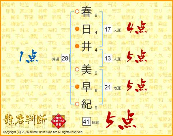春(9画)日(4画)井(4画) 美(9画)早(6画)紀(9画)