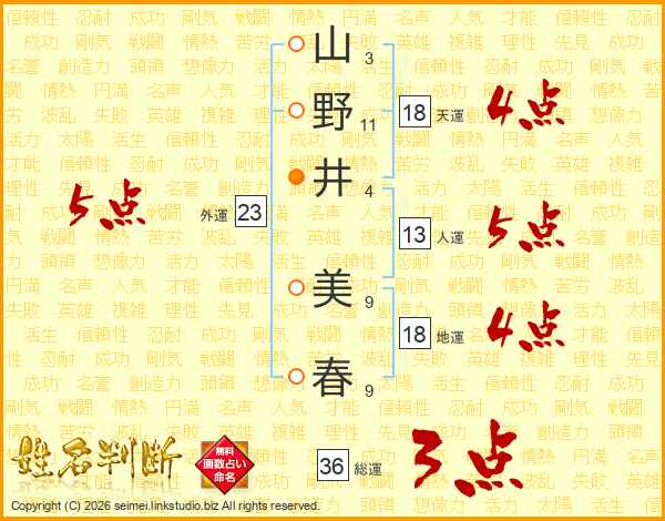 山野井美春さんの総運は36画の3点!