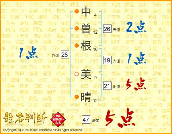 中(4画)曽(12画)根(10画) 美(9画)晴(12画)