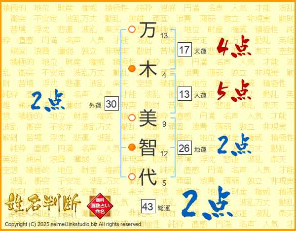 万(13画)木(4画) 美(9画)智(12画)代(5画)