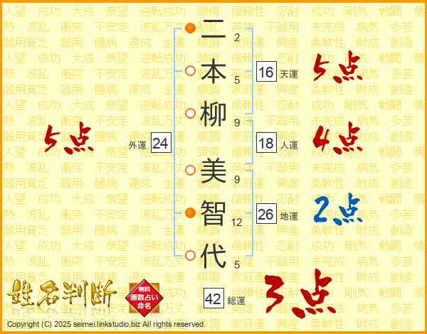 二(2画)本(5画)柳(9画) 美(9画)智(12画)代(5画)