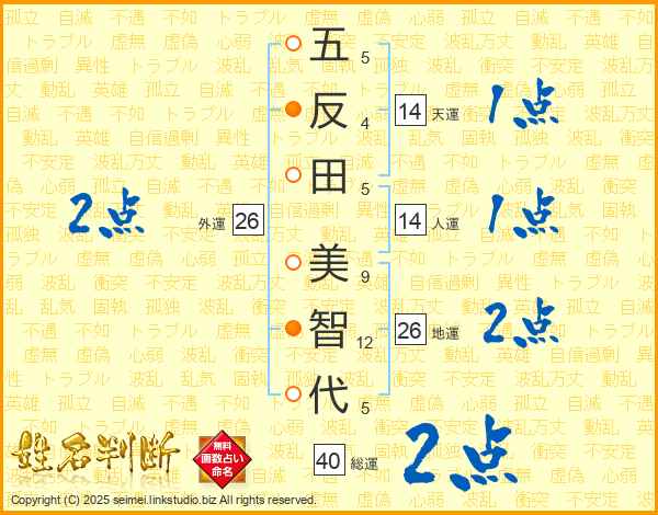 五(5画)反(4画)田(5画) 美(9画)智(12画)代(5画)