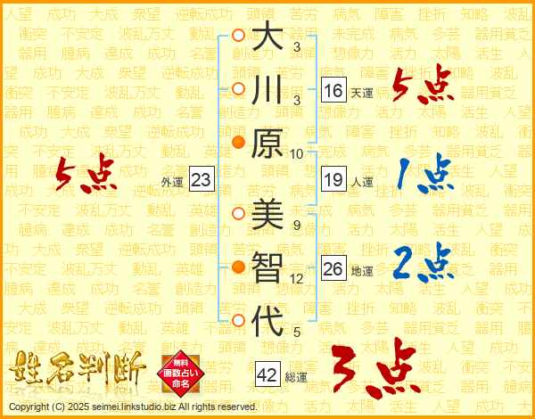 大(3画)川(3画)原(10画)  美(9画)智(12画)代(5画)