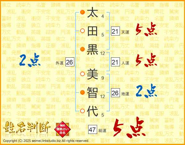 太(4画)田(5画)黒(12画) 美(9画)智(12画)代(5画)