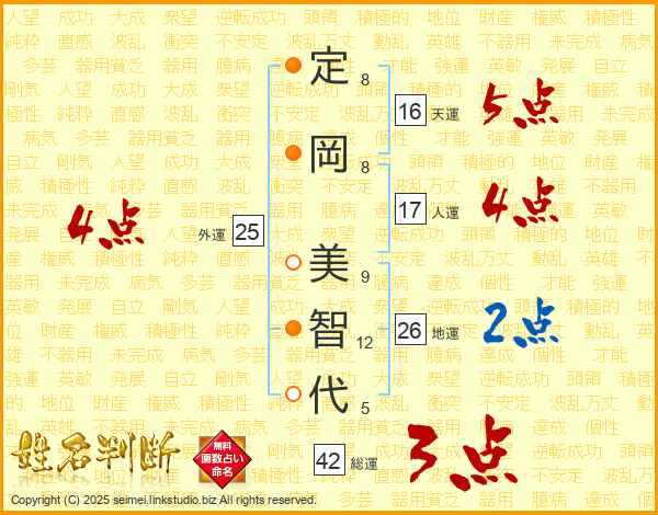 定(8画)岡(8画) 美(9画)智(12画)代(5画)