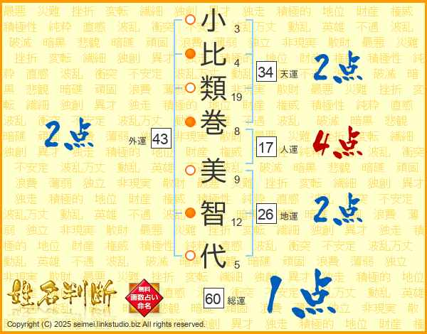 小(3画)比(4画)類(19画)巻(8画) 美(9画)智(12画)代(5画)