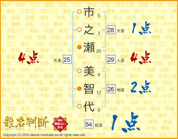市(5画)之(3画)瀬(20画) 美(9画)智(12画)代(5画)