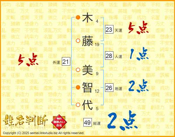 木(4画)藤(19画) 美(9画)智(12画)代(5画)
