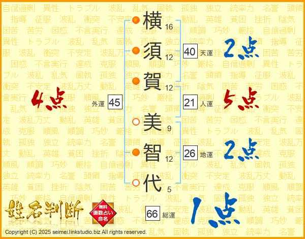 横(16画)須(12画)賀(12画) 美(9画)智(12画)代(5画)