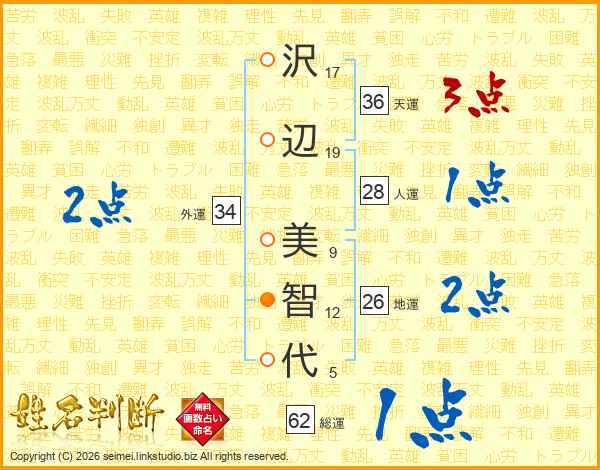 沢(17画)辺(19画) 美(9画)智(12画)代(5画)
