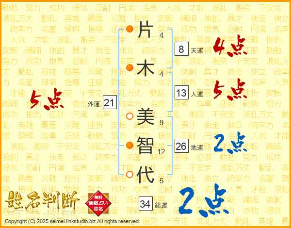 片(4画)木(4画) 美(9画)智(12画)代(5画)