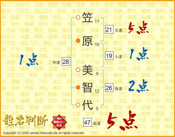 笠(11画)原(10画) 美(9画)智(12画)代(5画)