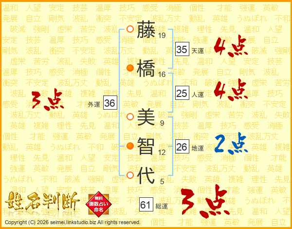 藤(19画)橋(16画) 美(9画)智(12画)代(5画)