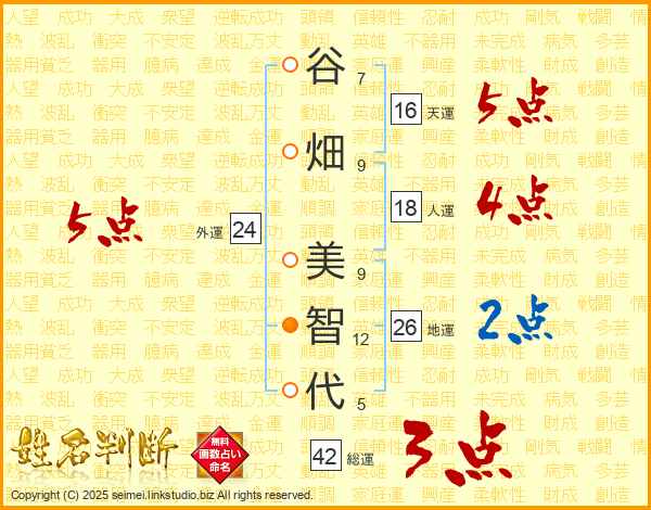 谷(7画)畑(9画) 美(9画)智(12画)代(5画)