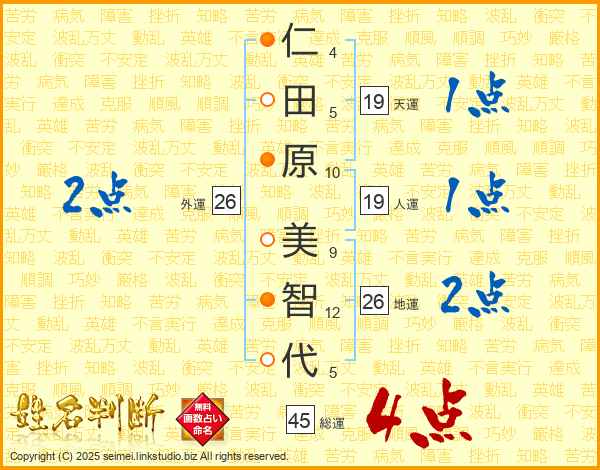 仁(4画)田(5画)原(10画) 美(9画)智(12画)代(5画)
