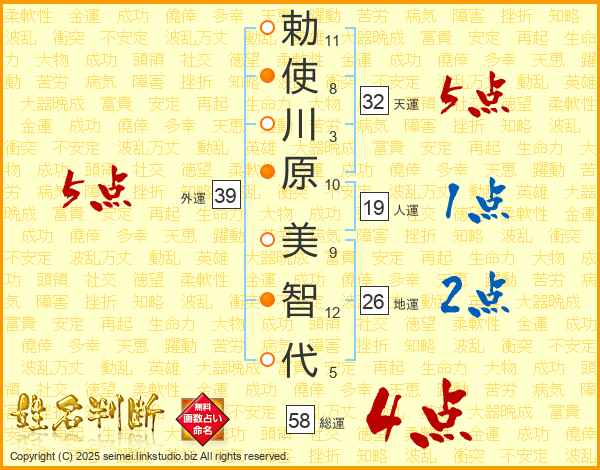 勅(11画)使(8画)川(3画)原(10画) 美(9画)智(12画)代(5画)