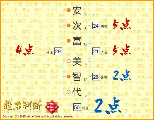 安(6画)次(6画)富(12画)  美(9画)智(12画)代(5画)