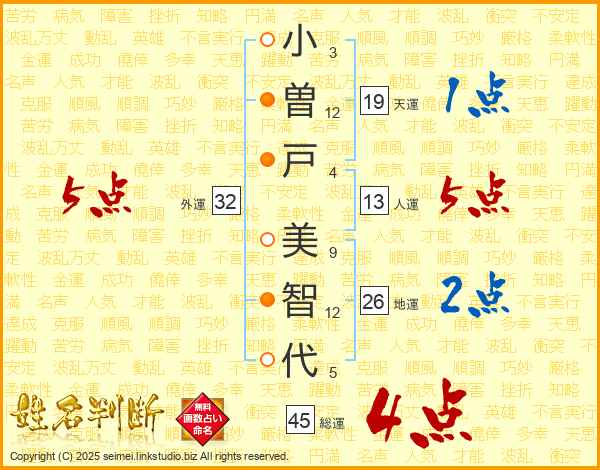 小(3画)曽(12画)戸(4画) 美(9画)智(12画)代(5画)