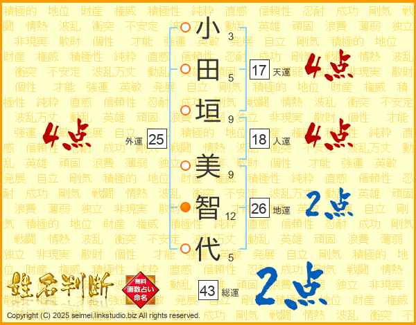 小(3画)田(5画)垣(9画) 美(9画)智(12画)代(5画)