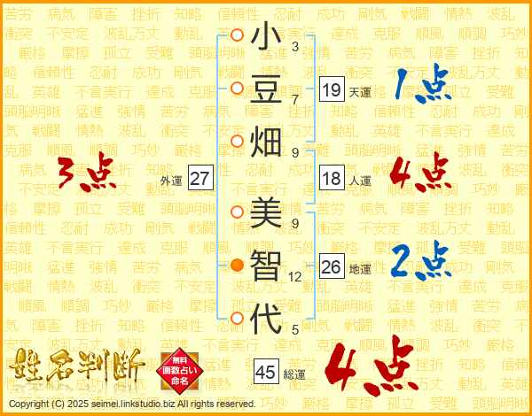 小(3画)豆(7画)畑(9画) 美(9画)智(12画)代(5画)
