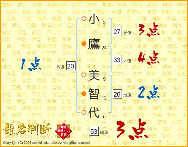 小(3画)鷹(24画) 美(9画)智(12画)代(5画)