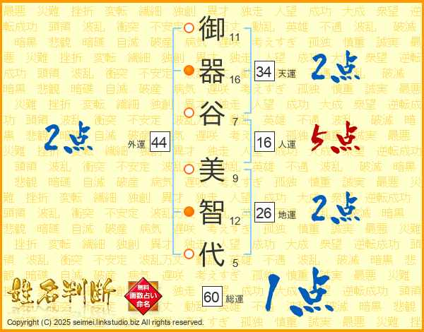 御(11画)器(16画)谷(7画) 美(9画)智(12画)代(5画)