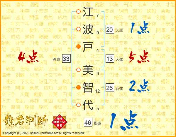 江(7画)波(9画)戸(4画) 美(9画)智(12画)代(5画)