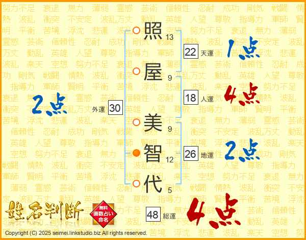照(13画)屋(9画) 美(9画)智(12画)代(5画)