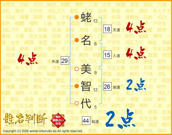 蛯(12画)名(6画) 美(9画)智(12画)代(5画)