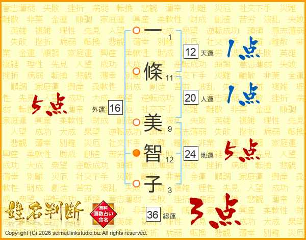 一(1画)條(11画) 美(9画)智(12画)子(3画)