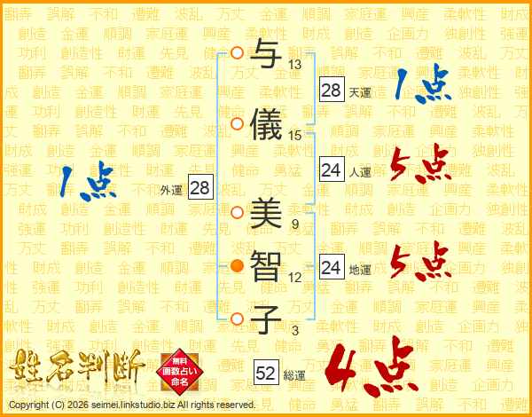 与(13画)儀(15画) 美(9画)智(12画)子(3画)