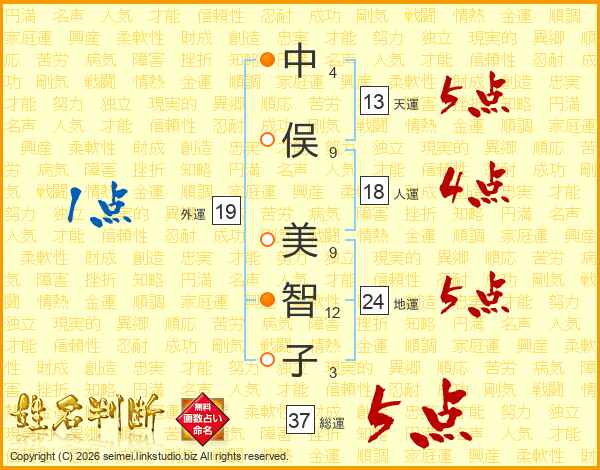 中(4画)俣(9画) 美(9画)智(12画)子(3画)