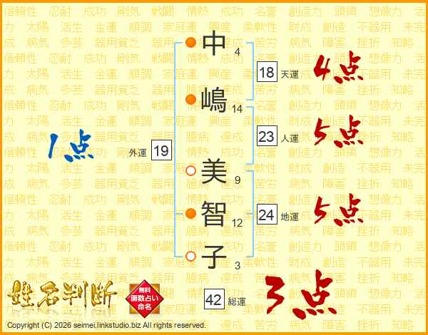 中(4画)嶋(14画) 美(9画)智(12画)子(3画)