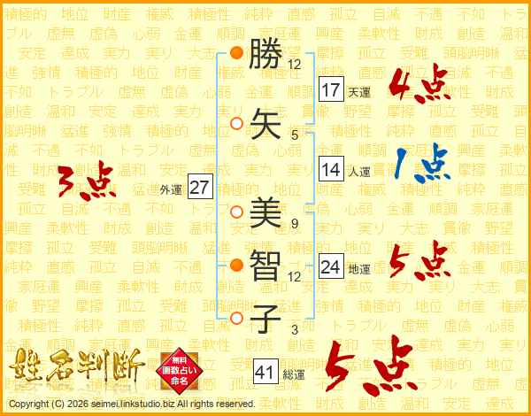 勝(12画)矢(5画) 美(9画)智(12画)子(3画)