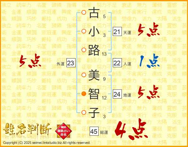 古(5画)小(3画)路(13画) 美(9画)智(12画)子(3画)