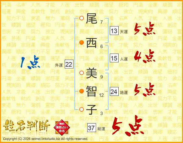 尾(7画)西(6画) 美(9画)智(12画)子(3画)
