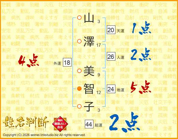 山(3画)澤(17画) 美(9画)智(12画)子(3画)