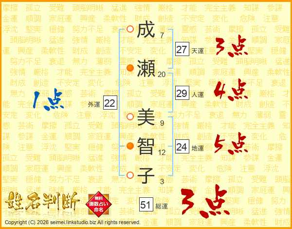 成(7画)瀬(20画) 美(9画)智(12画)子(3画)
