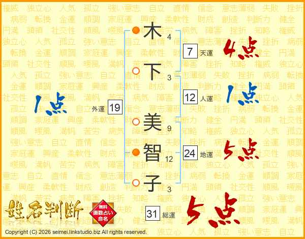 木(4画)下(3画) 美(9画)智(12画)子(3画)