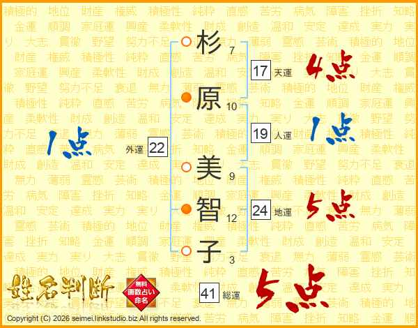 杉(7画)原(10画) 美(9画)智(12画)子(3画)