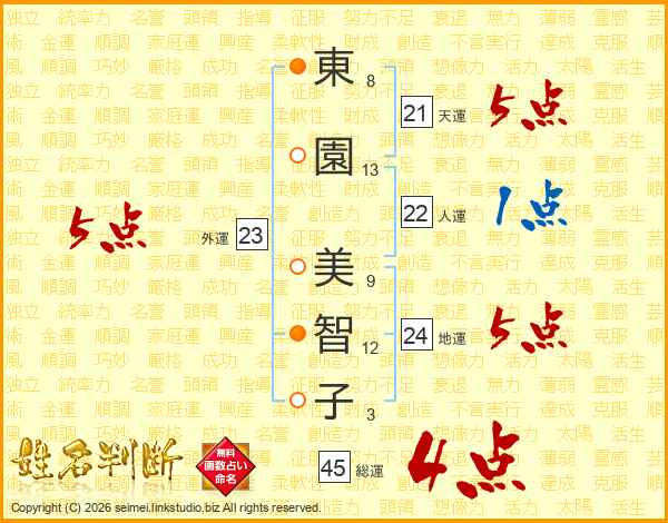 東(8画)園(13画) 美(9画)智(12画)子(3画)