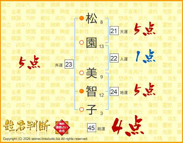 松(8画)園(13画) 美(9画)智(12画)子(3画)