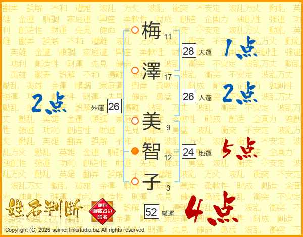 梅(11画)澤(17画) 美(9画)智(12画)子(3画)