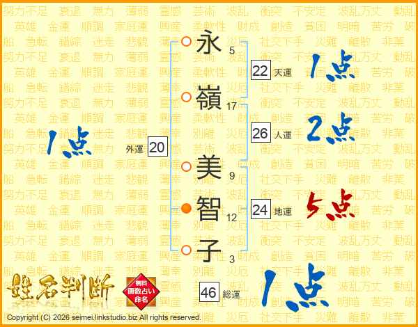 永(5画)嶺(17画) 美(9画)智(12画)子(3画)