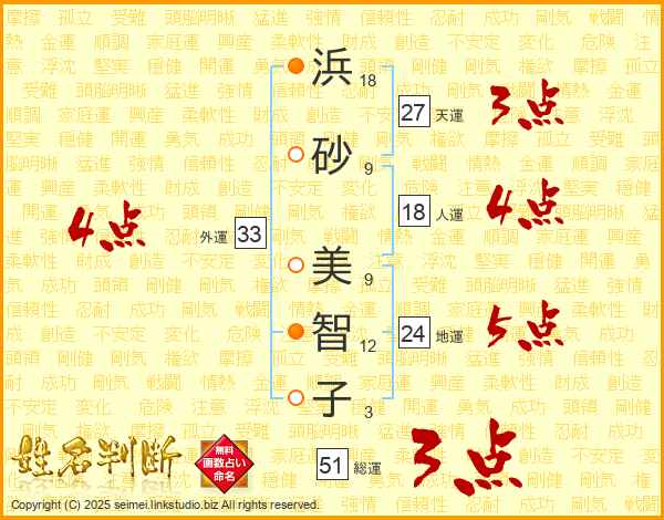 浜(18画)砂(9画) 美(9画)智(12画)子(3画)