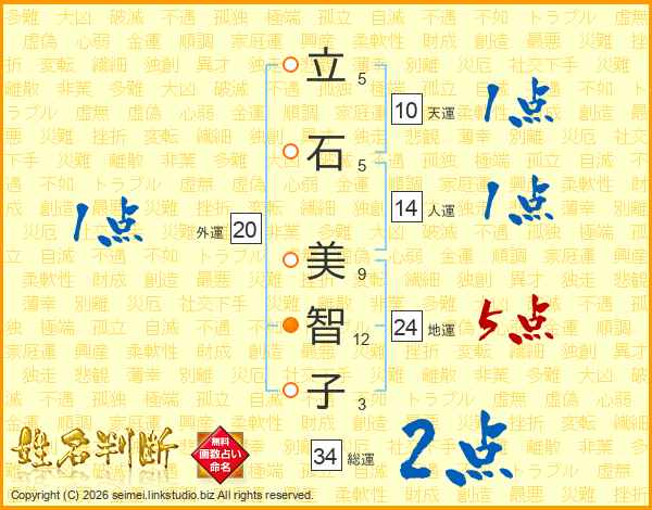 立(5画)石(5画) 美(9画)智(12画)子(3画)