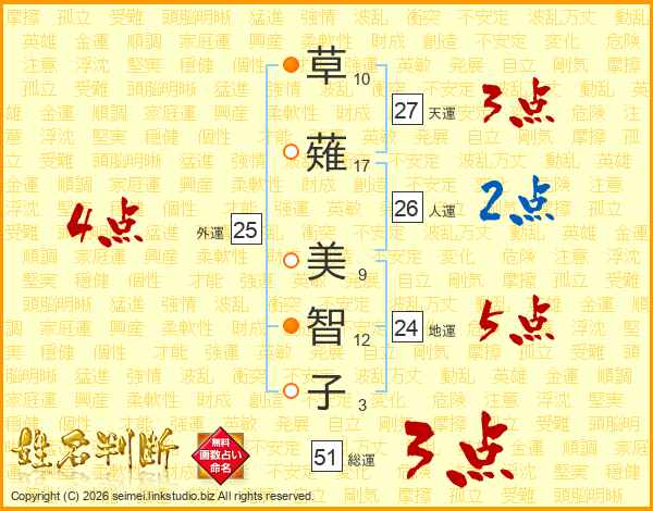 草(10画)薙(17画) 美(9画)智(12画)子(3画)