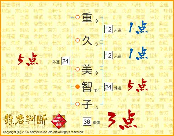 重(9画)久(3画) 美(9画)智(12画)子(3画)