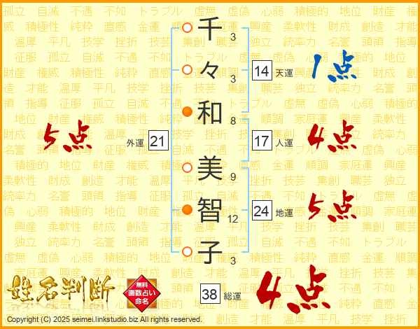 千(3画)々(3画)和(8画) 美(9画)智(12画)子(3画)